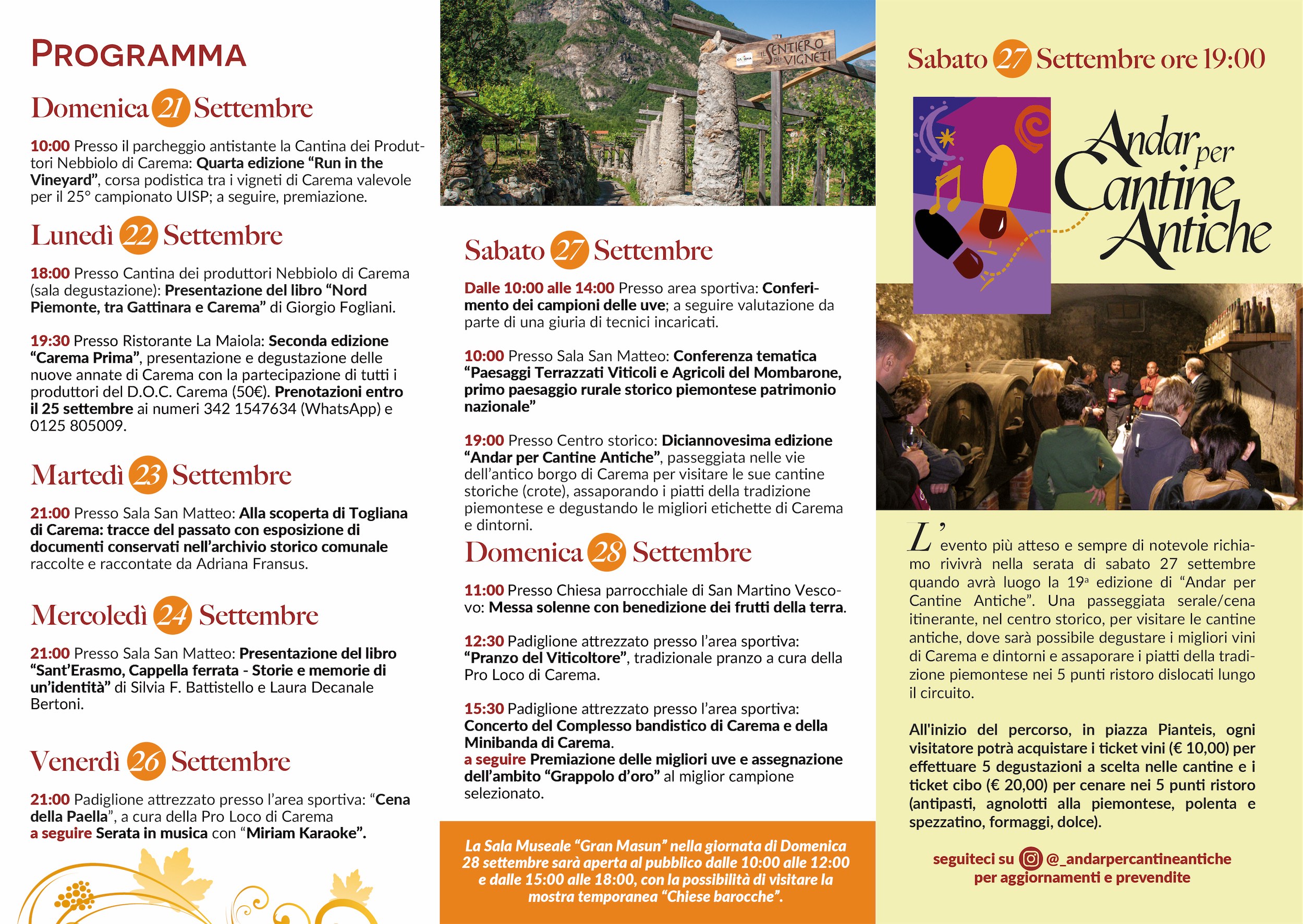 Sabato 27 settembre 2025 alle ore 19:00 nelle vie e nelle piazze del Centro storico: diciannovesima edizione “Andar per Cantine Antiche”, passeggiata nelle vie dell’antico borgo di Carema per visitare le sue cantine storiche (crote) con la possibilità di consumare una cena lungo il percorso dedicato, assaporando i piatti della tradizione piemontese e degustando le migliori etichette di Carema e dintorni.