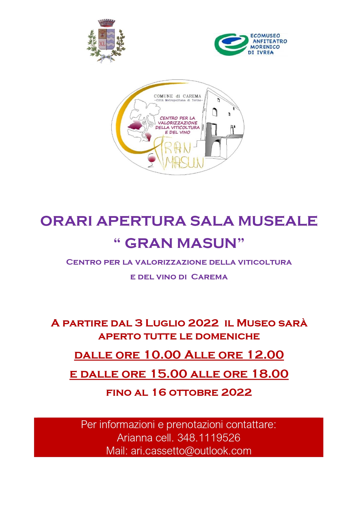 Description Costo Gratuito Attachments Documents orari apertura museo [.jpg 522,68 Kb - 13/04/2023] Contatti Name Description EMail info@comune.carema.to.it Phone 0125.811168 Last edit: 13/04/2023 09:31:41