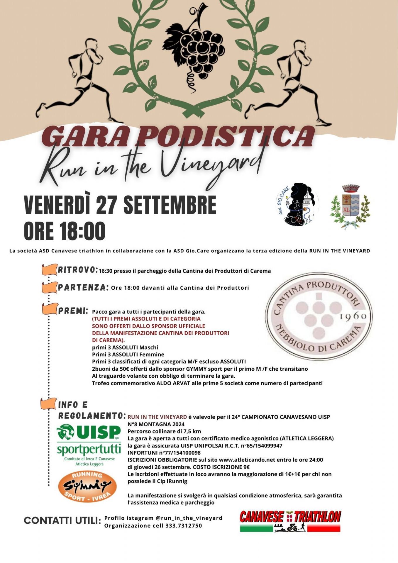 La ASD Canavese Triathlon e ASD Gio.Care hanno organizzato la 3a edizione della Run in the Vineyard che si svolgerà il 27 settembre alle ore 18:00 con partenza dal parcheggio adiacente la Cantina dei produttori di Carema main sponsor della gara. Il percorso è invariato e si snoderà per 7,5 km tra i vari saliscendi di Carema passando in mezzo alle caratteristiche vigne, i pilun e le toppie. E' possibile preiscriversi al sito www.atleticando.net oppure, con un piccolo aumento di prezzo, il giorno della gara.