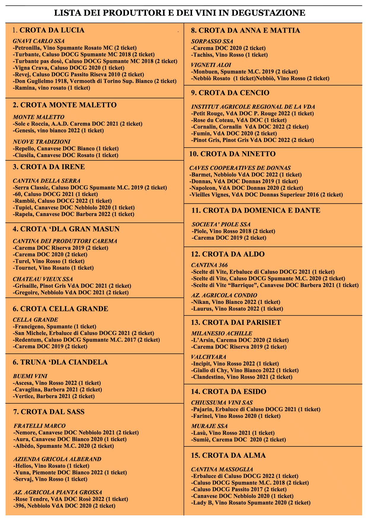 All'inizio del percorso, in piazza Pianteis, ogni visitatore potrà acquistare i ticket vini (€ 10,00) per effettuare 5 degustazioni a scelta nelle 15 cantine e i ticket cibo (€ 18,00) per cenare nei 5 punti ristoro (antipasti, agnolotti alla piemontese, cotechino e patate, formaggi, dolce).