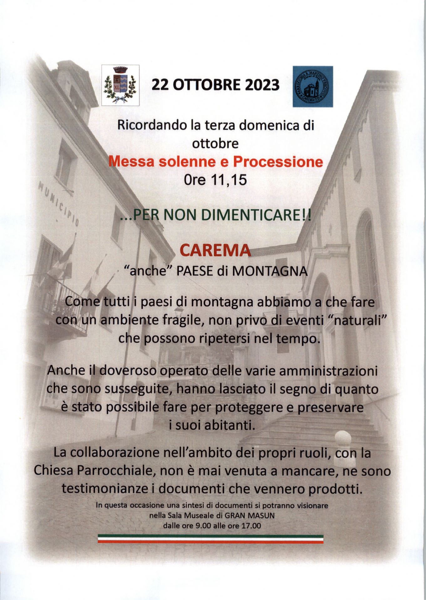 Description Messa solenne e processione Costo Gratuito Attachments Documents Terza domenica di ottobre [.pdf 968,64 Kb - 20/10/2023] Contatti Name Description EMail info@comune.carema.to.it Phone 0125.811168 Last edit: 20/10/2023 12:29:31