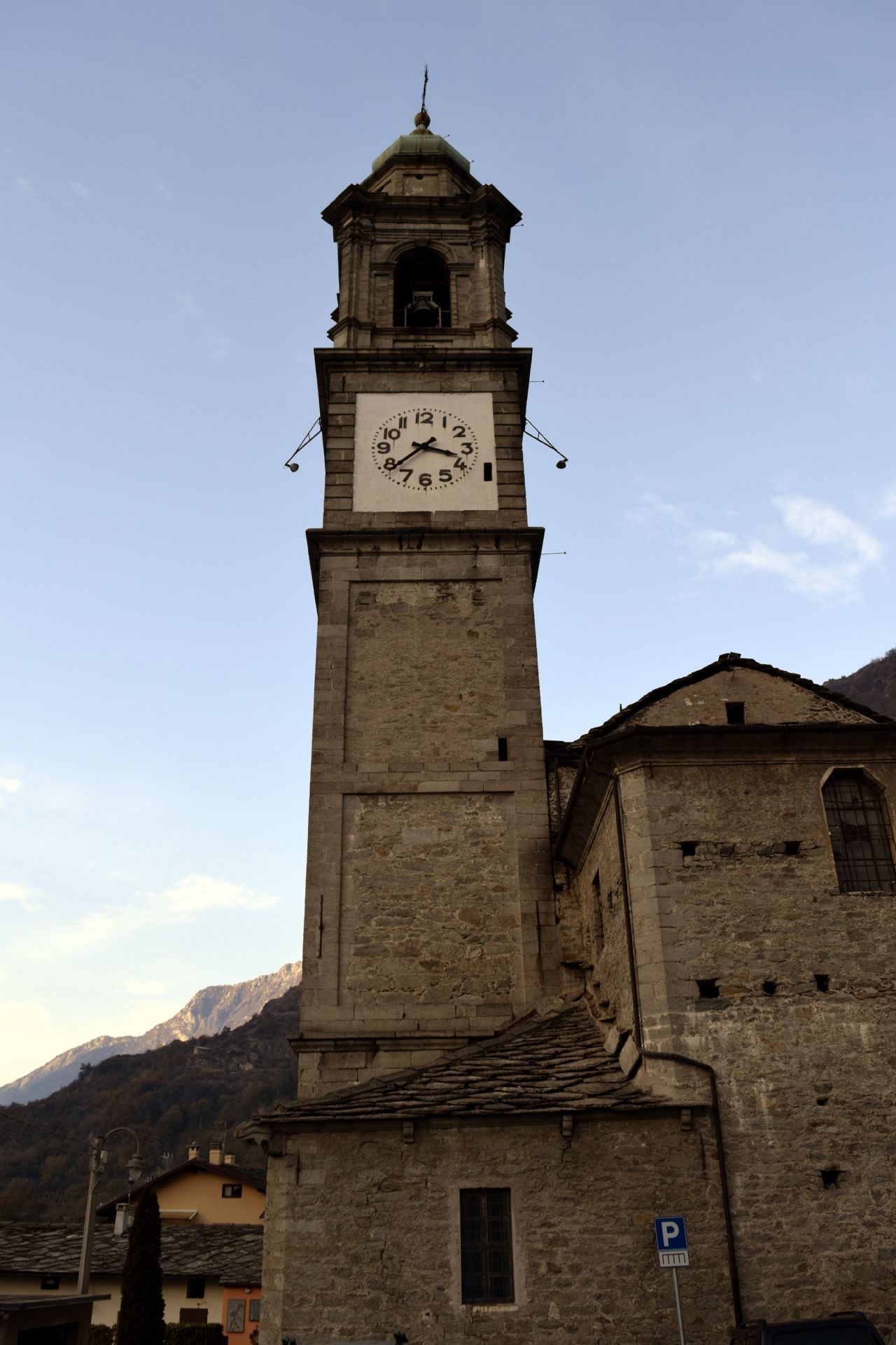 Interamente in pietra, la torre campanaria è alta 60 m e all’interno si contano 108 scalini.