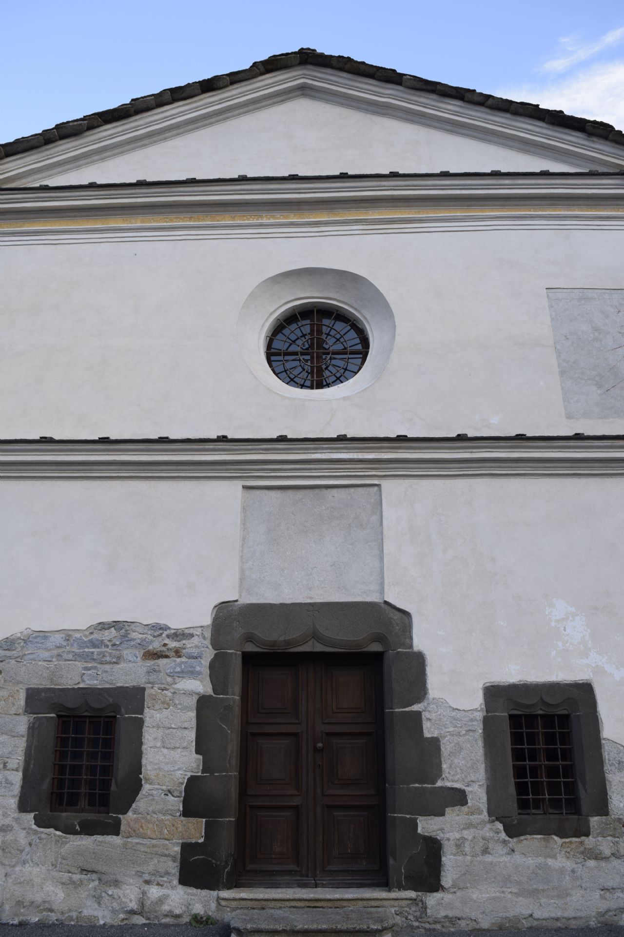 Sulla facciata romanica si ritrovano, scolpiti negli stipiti in pietra del portale e dell’architrave delle finestre, le decorazioni a goccia rovesciata tipiche del Medioevo valdostano.