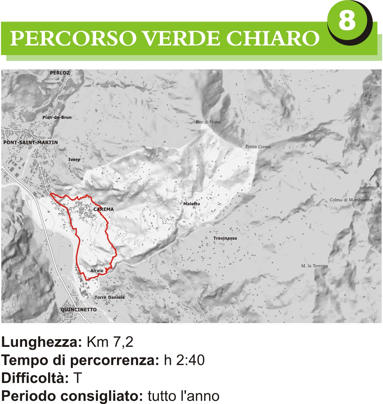 Il percorso parte e arriva dall'Area sportiva a quota 295 m; la quota più alta è posta a quota 558 m in località Bura Canun.