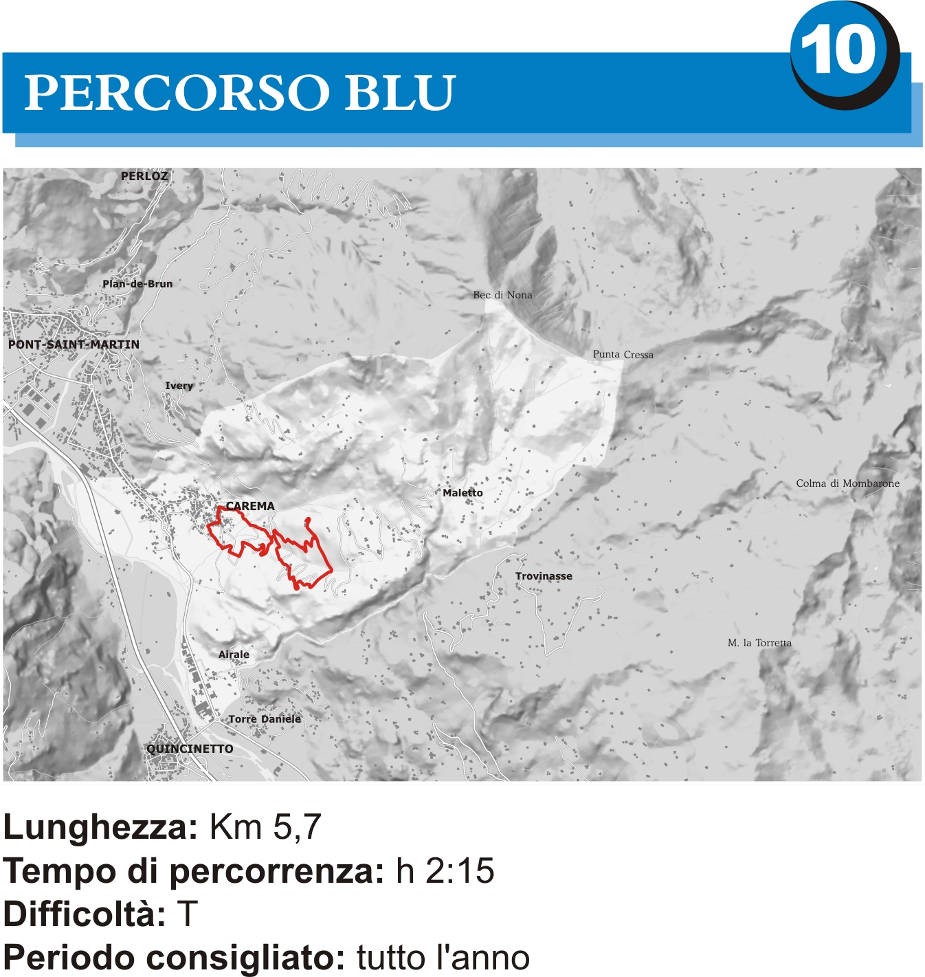 Il percorso parte e arriva dalla Gran Masun a quota 355 m; la quota più alta è posta a 769 m in località Prà dei Banchi.