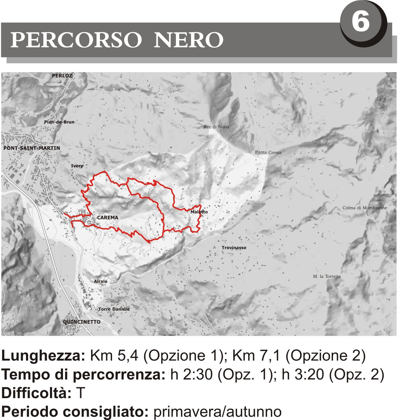 Il percorso parte dalla Cantina dei Produttori Nebbiolo Carema a quota 293 m e arriva all'Alpe Maletto a 1325 m.