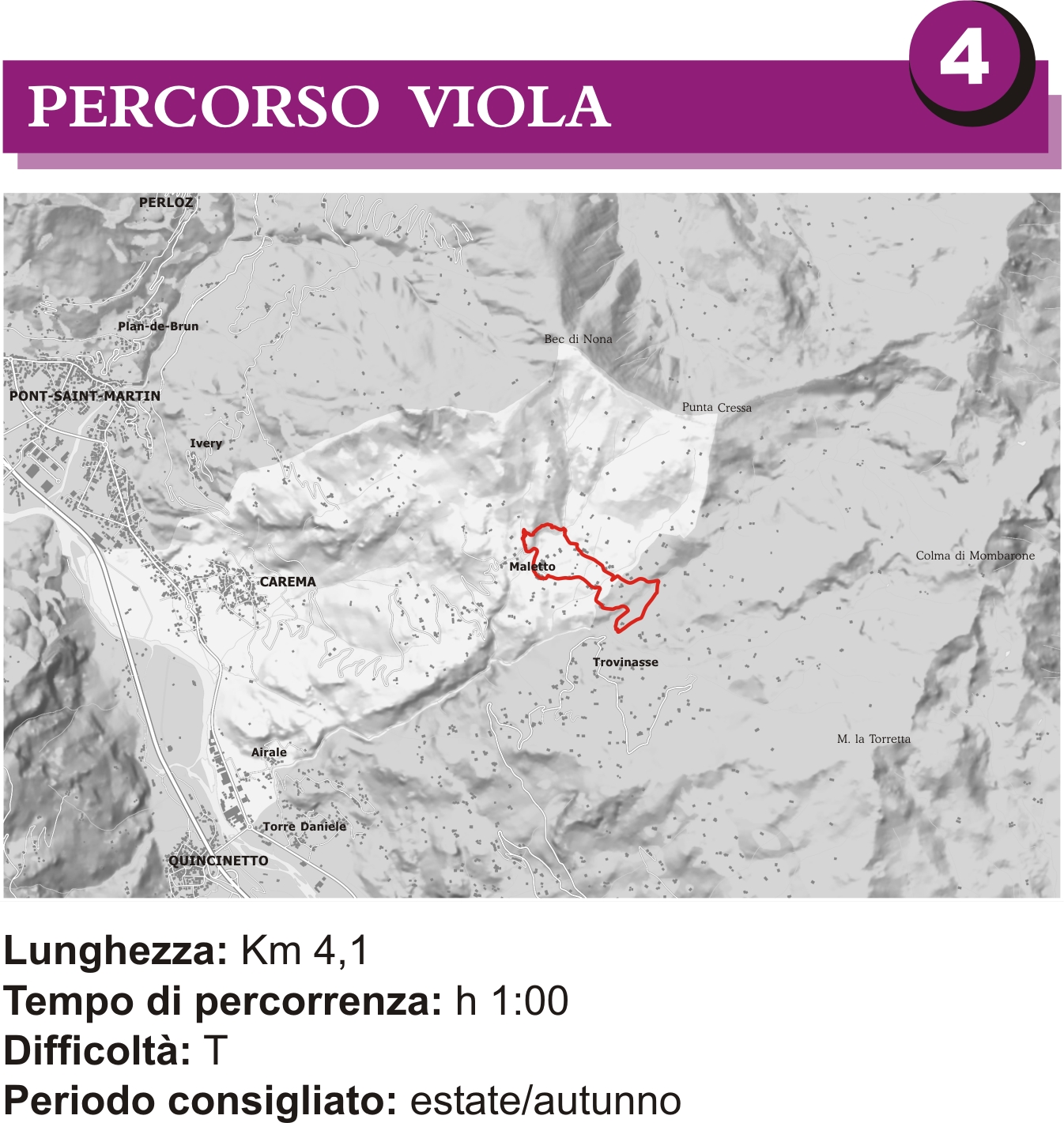 Il percorso parte e arriva all'Alpe Maletto a 1325 m; la quota più alta è posta a 1395 m in località Tetto Bianco.